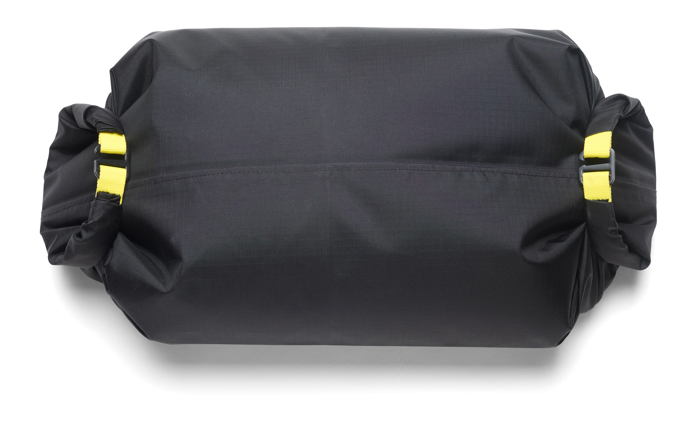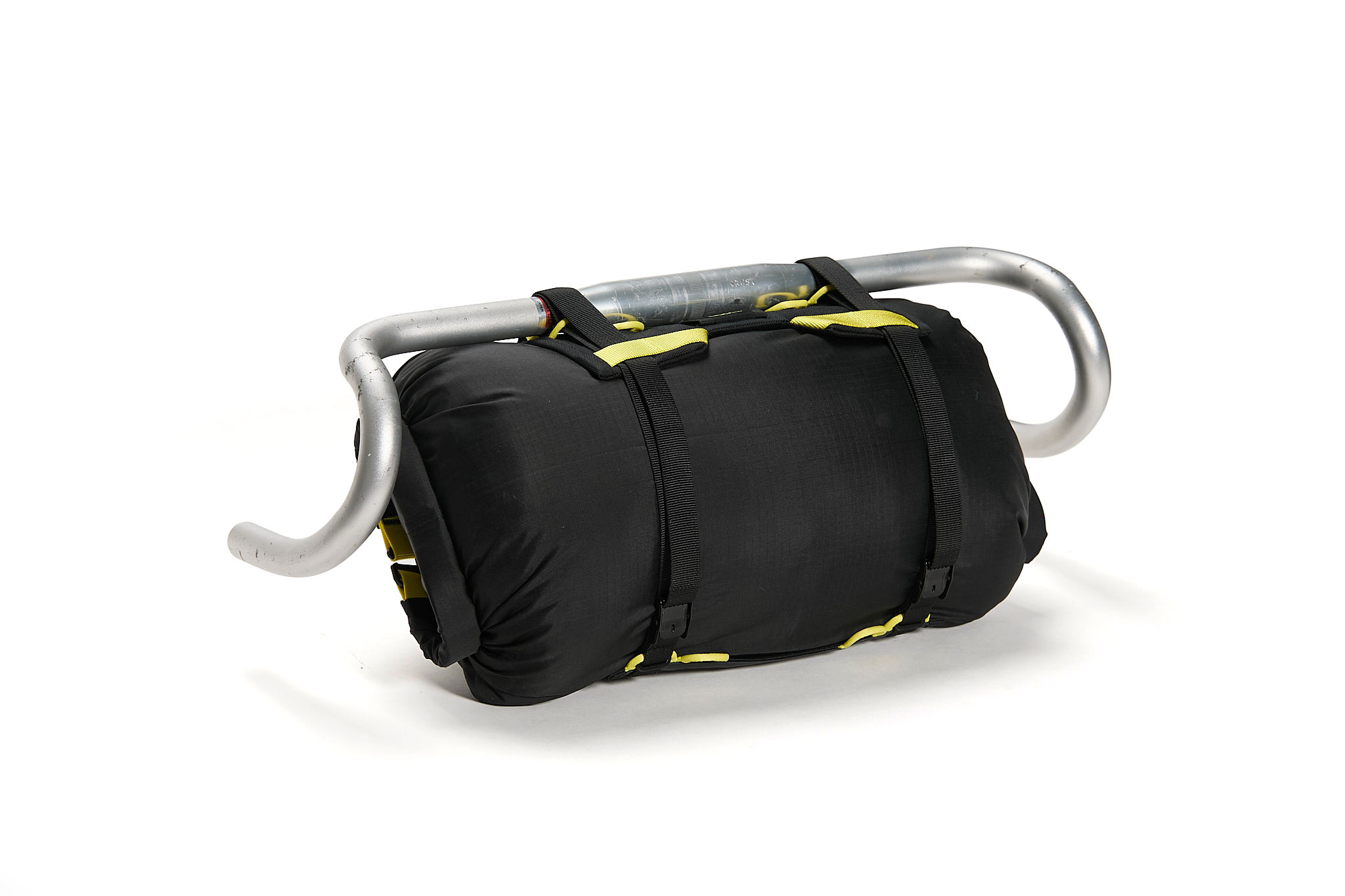 CARRIE ergänzt diesen Ansatz mit einem bewusst vereinfachten Lenkertaschensystem aus Cradle und wasserdichtem 18-Liter-Drybag. Statt mehrerer Gurtpaare kommen lediglich zwei Zurrgurte zum Einsatz, die gleichzeitig Halterung und Kompression übernehmen. Das reduziert Montageaufwand und Gewicht deutlich. Zusätzliche Befestigungspunkte erlauben die flexible Erweiterung des Setups. Besonderes Merkmal ist die konsequente Materialstrategie: die Halterung besteht vollständig aus PET-basierten Materialien und ist damit als Mono-Material-Konstruktion besonders gut recycelbar – ein klarer Schritt in Richtung nachhaltiger Produktgestaltung im Bikepacking-Segment.