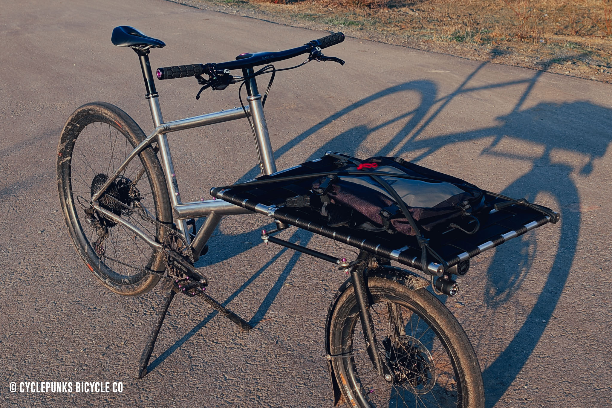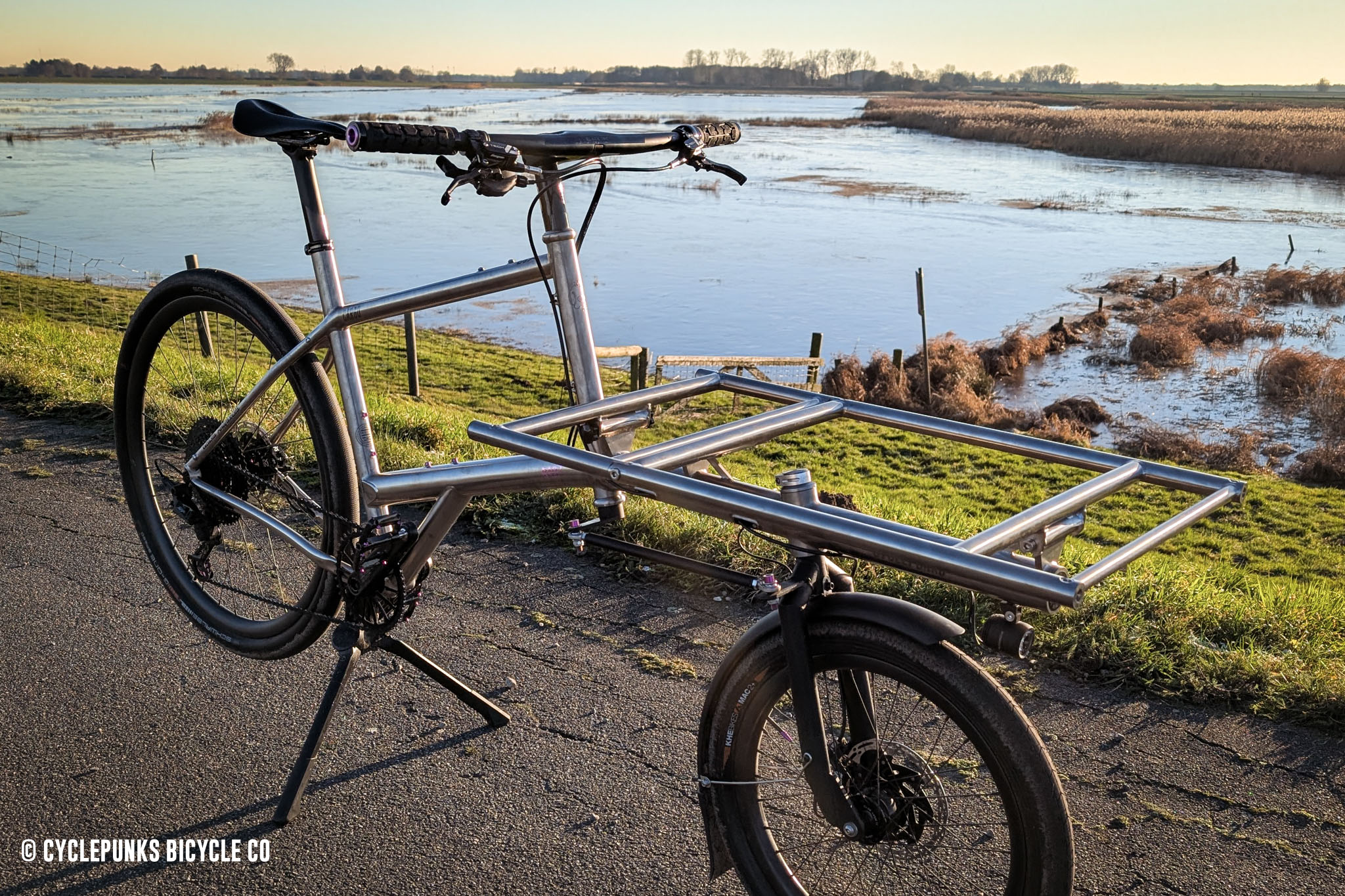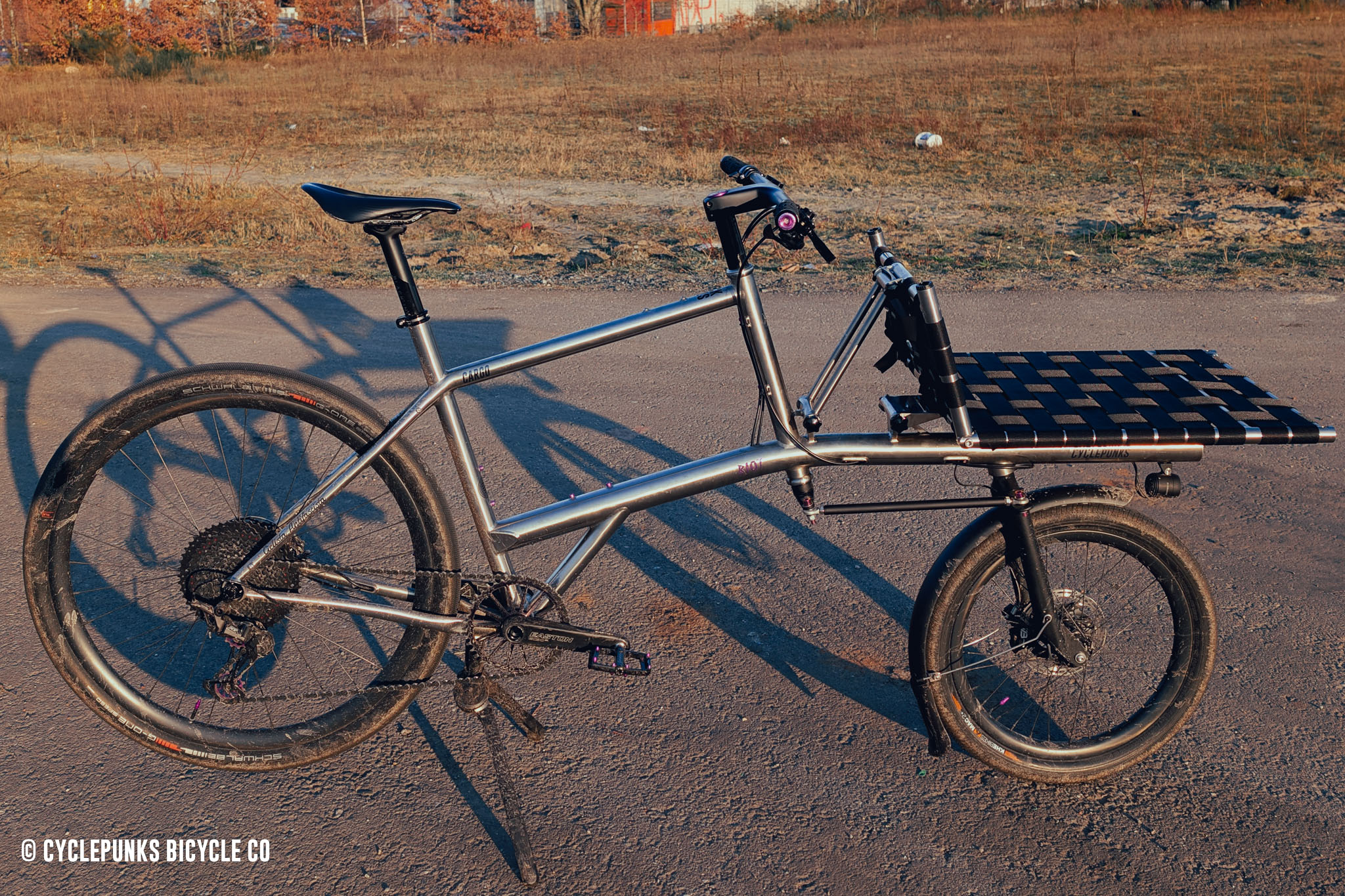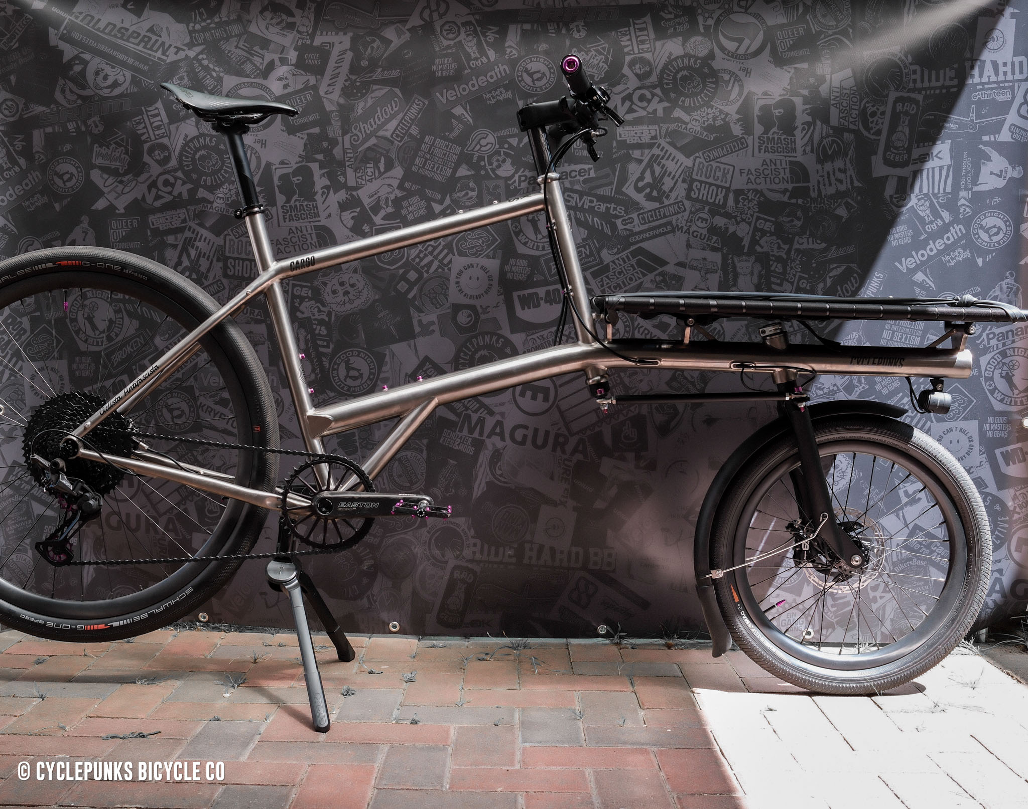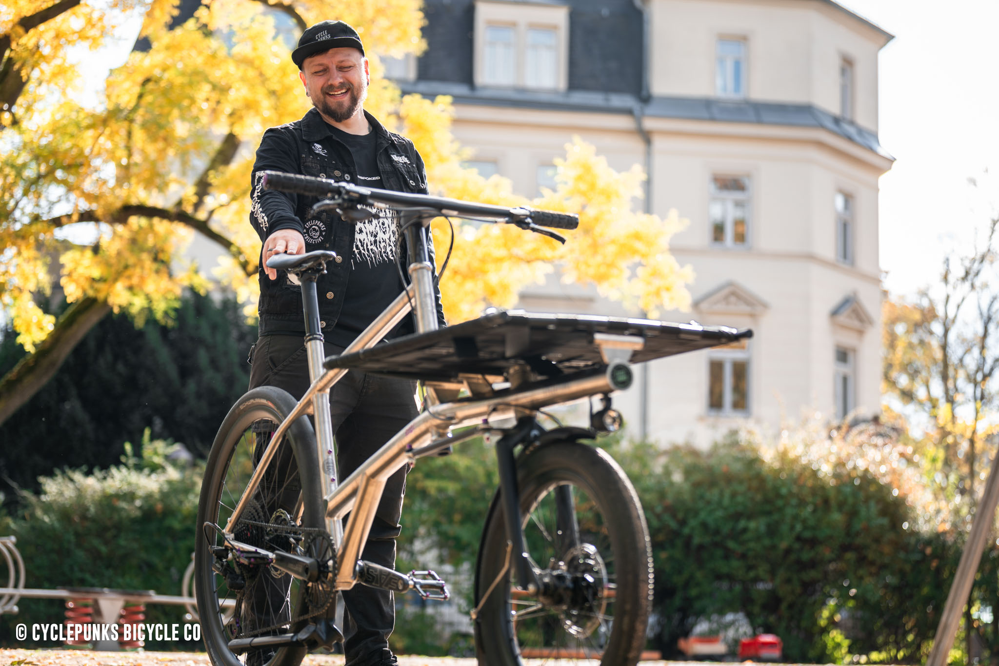 Das CYCLEPUNKS TiCa ist ein ultraleichtes und agiles Lastenrad aus Titan, das die sportliche Fahrweise eines Gravelbikes mit der enormen Nutzlast eines Transporters verbindet.
