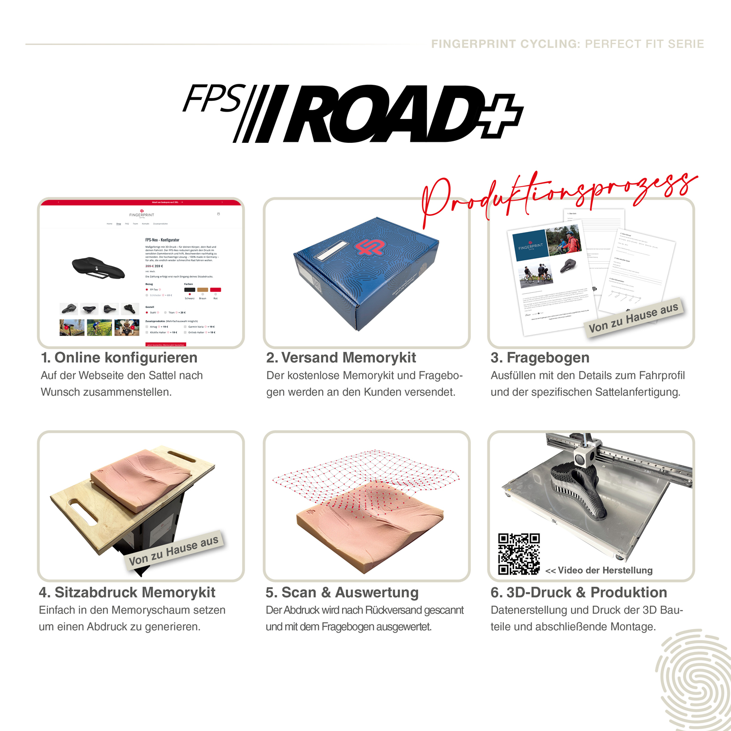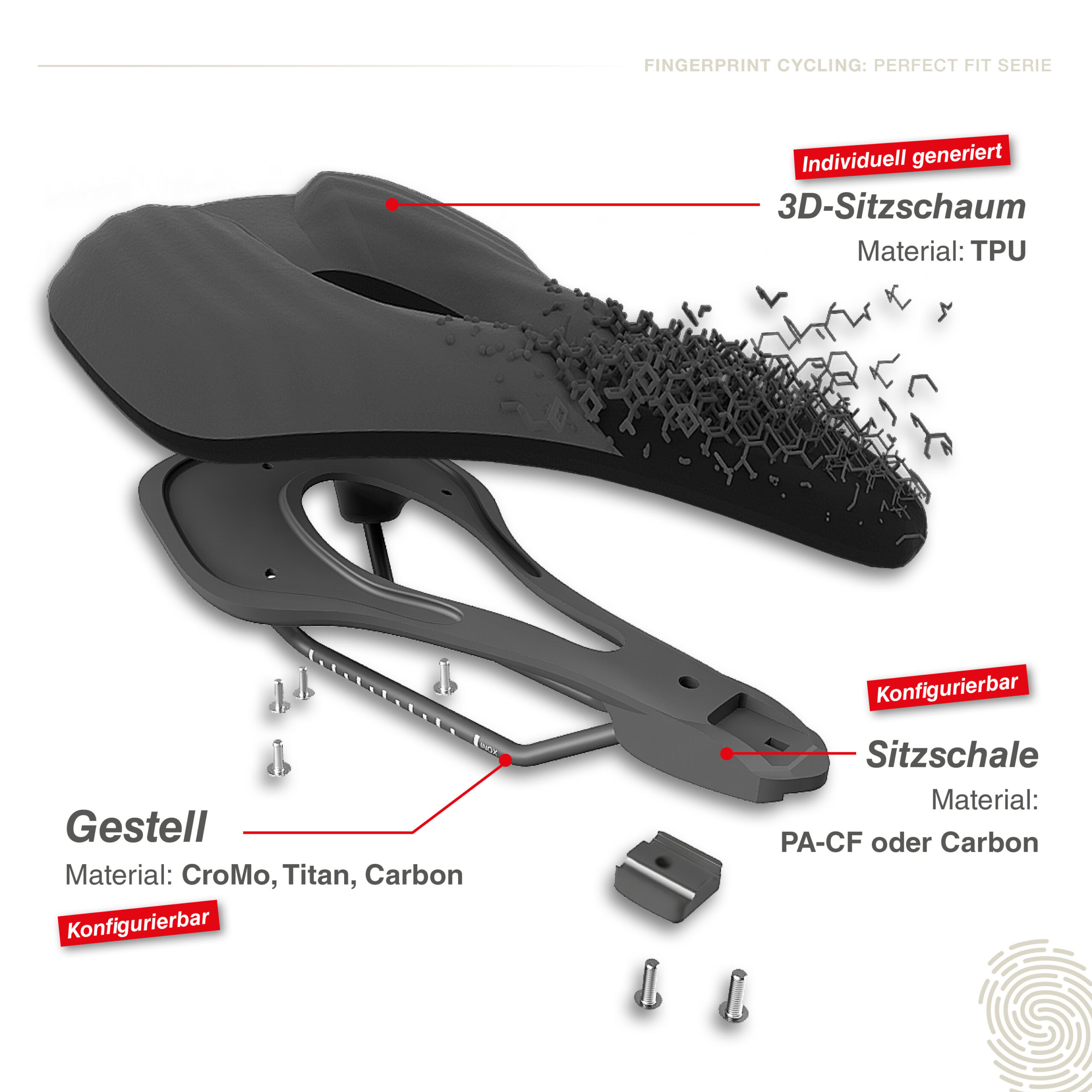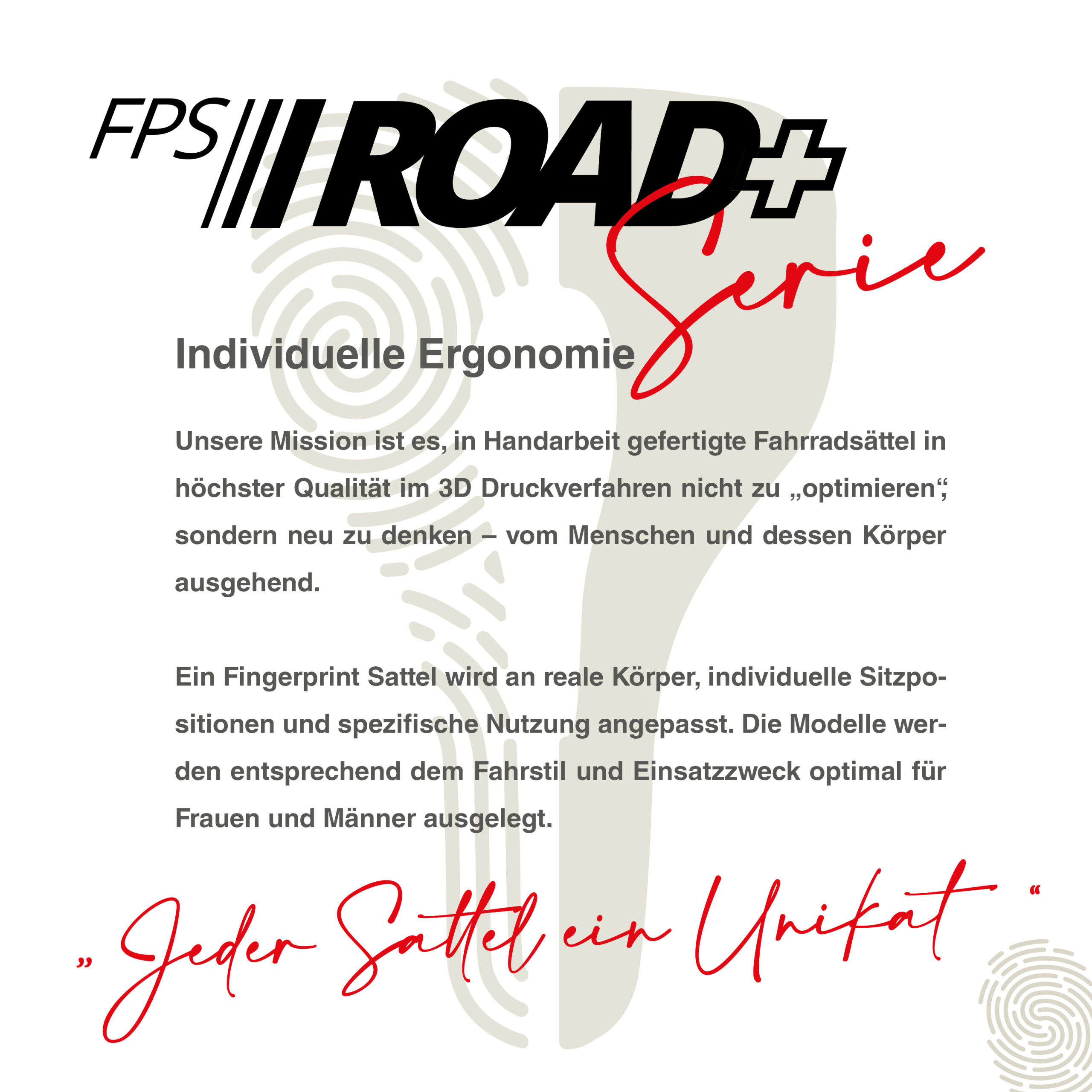 Der FPS-ROAD+ ist ein individuell berechneter Rennradsattel der PERFECT FIT SERIE von Fingerprint Cycling. Er wird vom Menschen und dessen Anatomie aus entwickelt und verbindet Komfort, Performance und Robustheit auf Basis ingenieurwissenschaftlicher Methoden aus Maschinenbau und Materialwissenschaften.