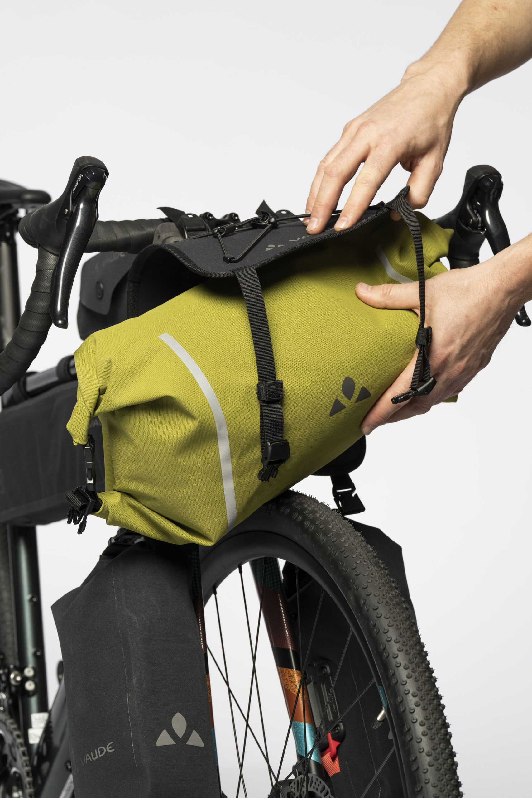 Mit der Trail-Serie stellt VAUDE komplett neue Taschen fürs Bikepacking-Abenteuer vor. Wasserdichte Qualität, funktionale Details und eine sichere Befestigung am Rad für Touren mit hohem Geländeanteil und minimalem Gepäck. Das Hauptmaterial des wasserdichten und herausnehmbaren Packsacks besteht überwiegend aus recyceltem Polyamid.