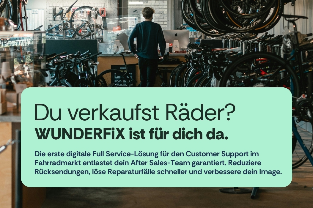 Mit dem Remote Repair Service von WUNDERFiX bieten wir eine neue, moderne Customer Support-Lösung, die im Gewährleistungsfall allen Beteiligten das Leben erleichtert: Fahrradfahrenden, die schnell wieder im Sattel sitzen möchten; Fahrradversendende, die ineffiziente After Sales-Prozesse vermeiden möchten; Fachwerkstätten, die sich bürokratiearm ums Wesentliche kümmern möchten.