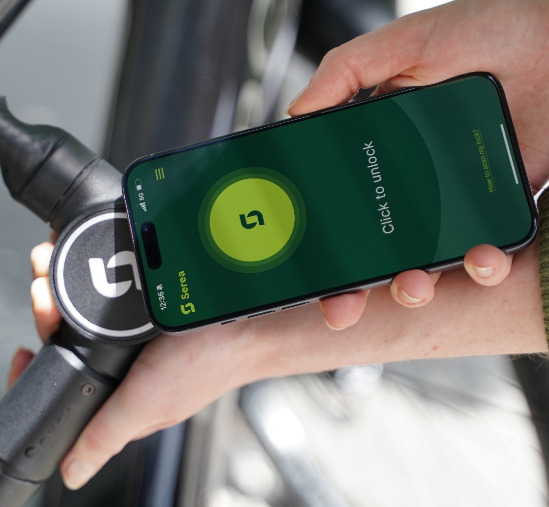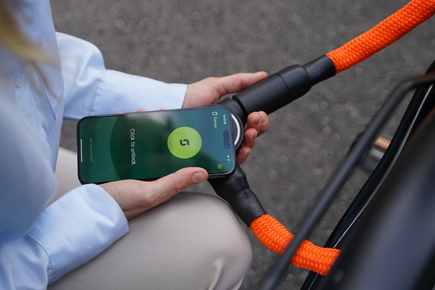 Das Serea-Fahrradschloss kommt komplett ohne Schlüssel und ohne Batterie aus. Es nutzt NFC-Technologie – dieselbe, die auch beim kontaktlosen Bezahlen zum Einsatz kommt. Ein physischer Schlüssel ist also überflüssig. Gesteuert und entsperrt wird das Schloss ausschließlich über die Serea App. Dort legen Nutzerinnen und Nutzer ein Konto an und verbinden ihr Schloss mithilfe des mitgelieferten PUK-Codes.