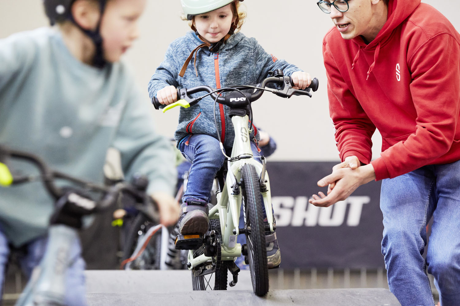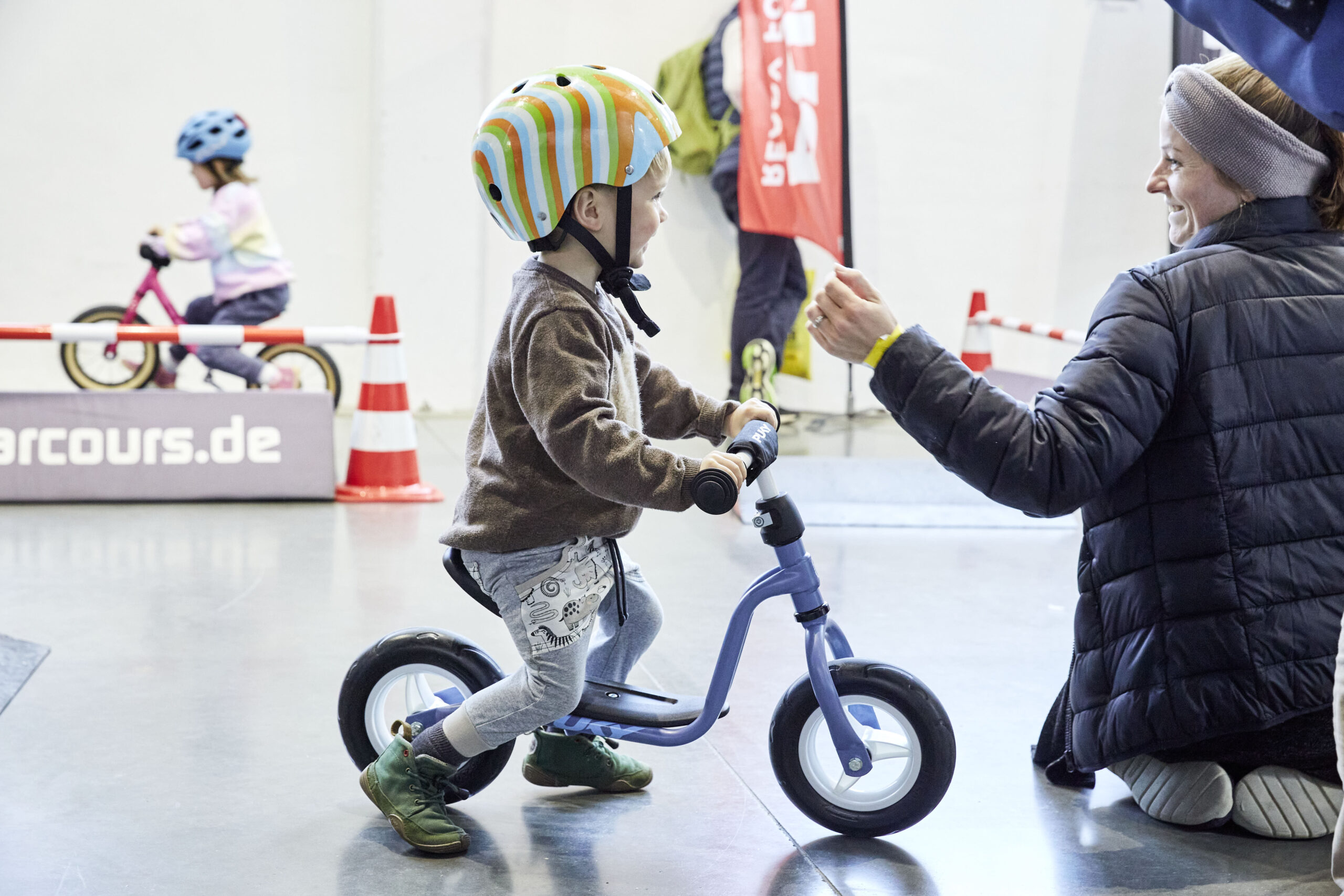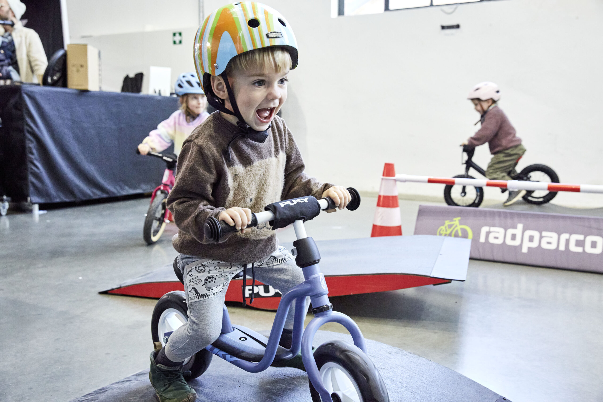 Kleine Entdecker:innen von ca. 2–4 Jahren starten auf dem Laufradparcours, während größere Kids von ca. 4–12 Jahren auf einem separaten Fahrradparcours ihre Geschicklichkeit testen können. Über kleine Hindernisse, Kurven und Challenges lernen sie spielerisch Balance, Kontrolle und Selbstvertrauen auf zwei Rädern.